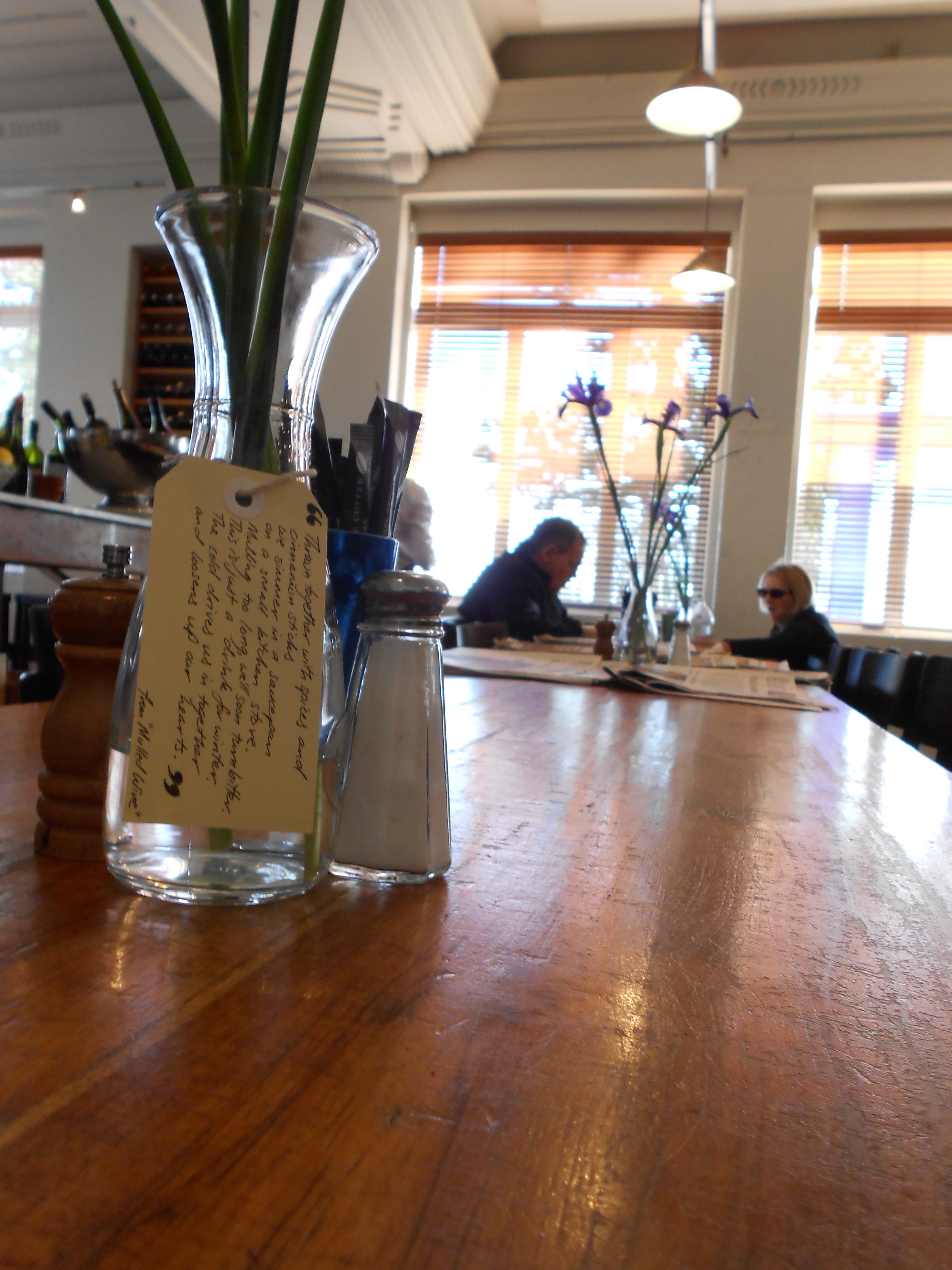 Now the vases have a new addition: ‘poetry tags’. Every other vase has a tag tied to it, and each tag carries an excerpt from one of my poems. Diners can read a grab of poetry while they eat, and maybe it’ll inspire them to check out some more local poetry.